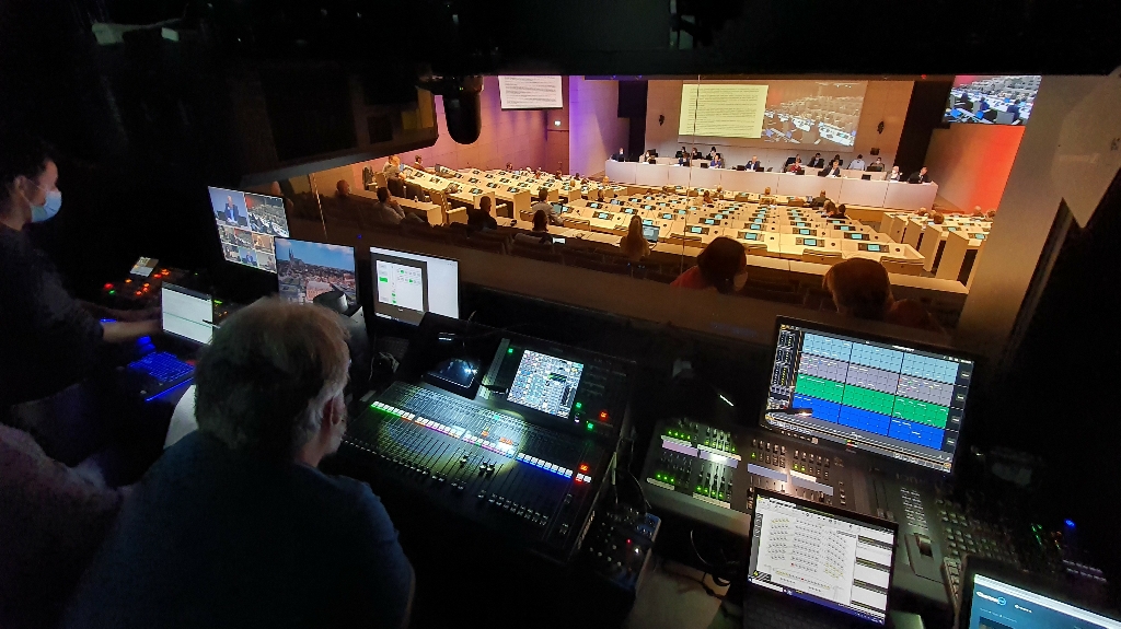 Pupitres multimédia tactiles, votes, caméras et vidéoprojection, sonorisation, éclairage scénique, enregistrement, archivage, streaming, visioconférence, régies de diffusion et captation, automation